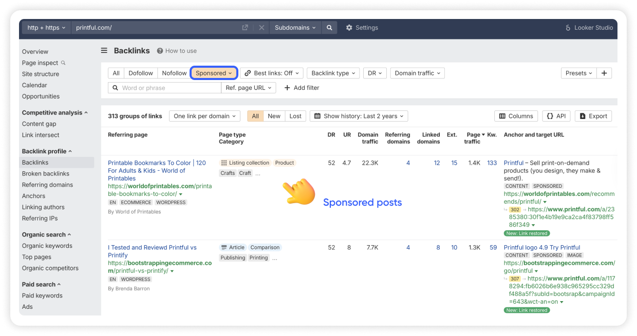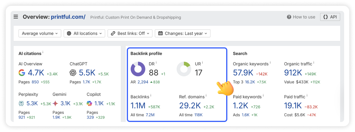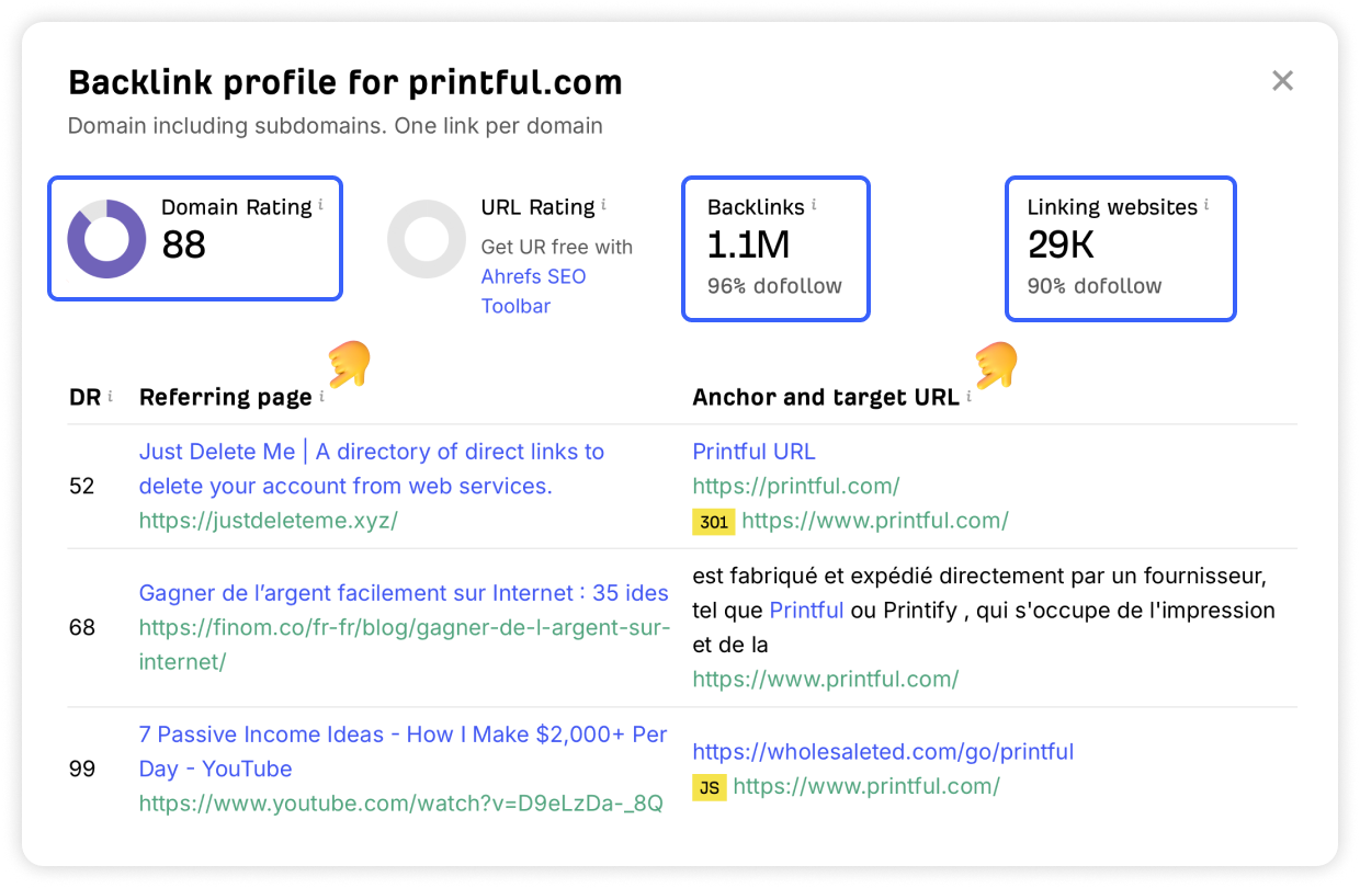 For our final example, let's look at Printful, a leader in the print-on-demand industry. On Ahrefs, they have a Domain Rating (DR) of 88 with over 1.1 million backlinks from 29,000 referring domains.