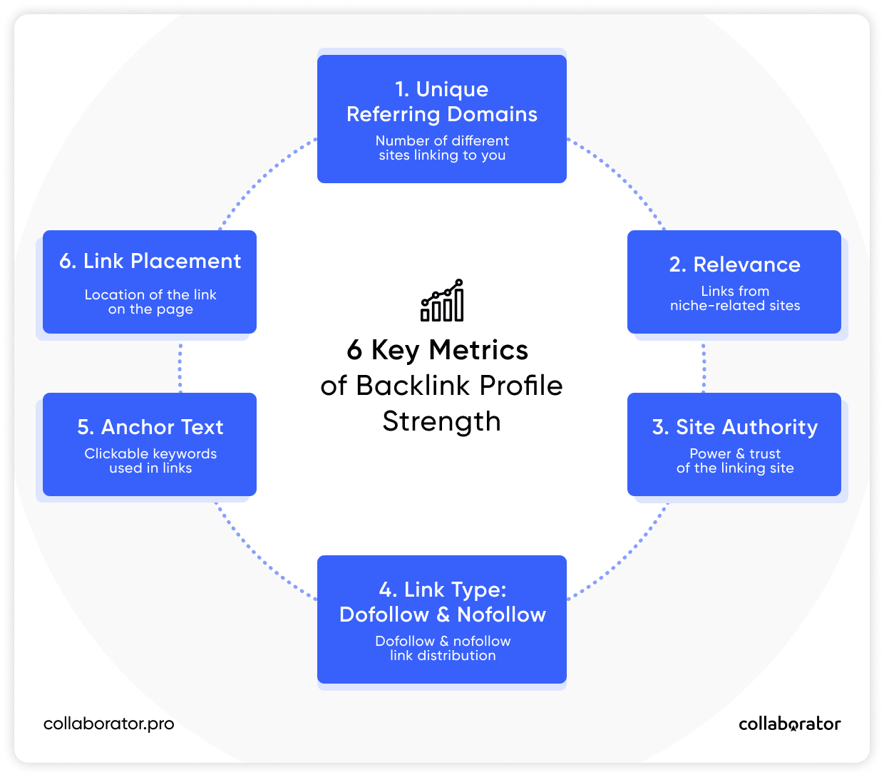 A link profile is built from several data points. While some SEO experts might prioritize them differently, these are the 6 main metrics that determine how strong your profile is: