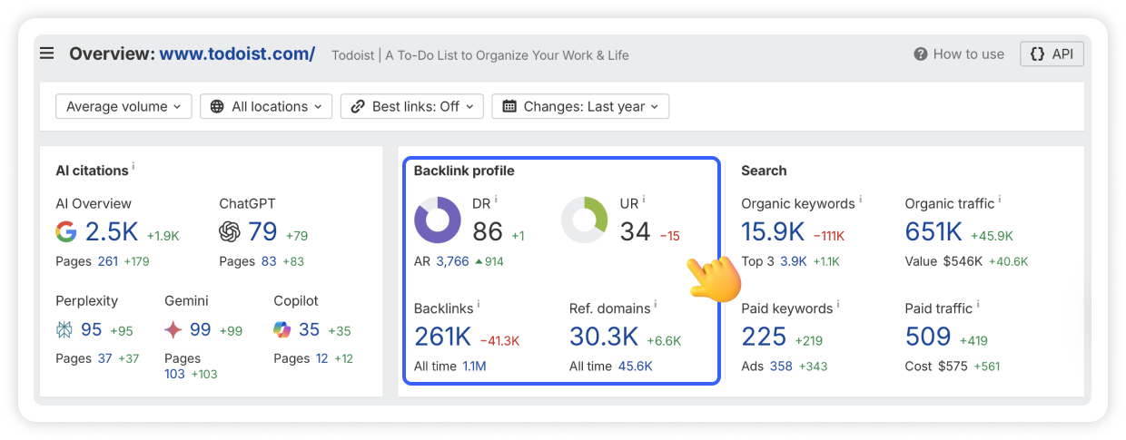 Todoist is a well-known player in the task management industry. Ahrefs data shows that they have a Domain Rating (DR) of 86 with 261,000 active backlinks from over 30,000 referring domains.