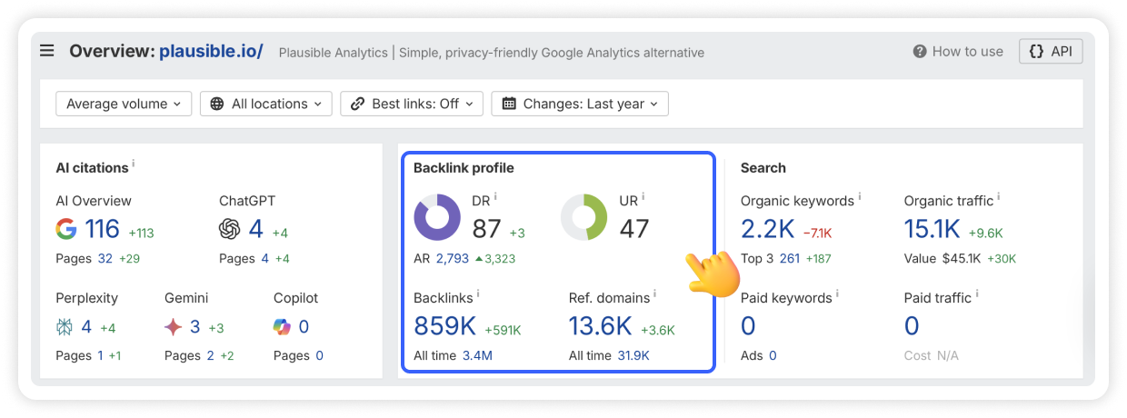 Plausible is a privacy-focused analytics platform. On Ahrefs, their backlink profile looks quite impressive with a DR of 87 and over 13,000 referring domains.