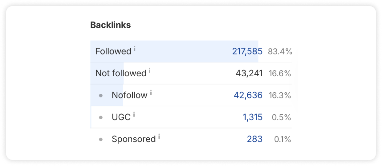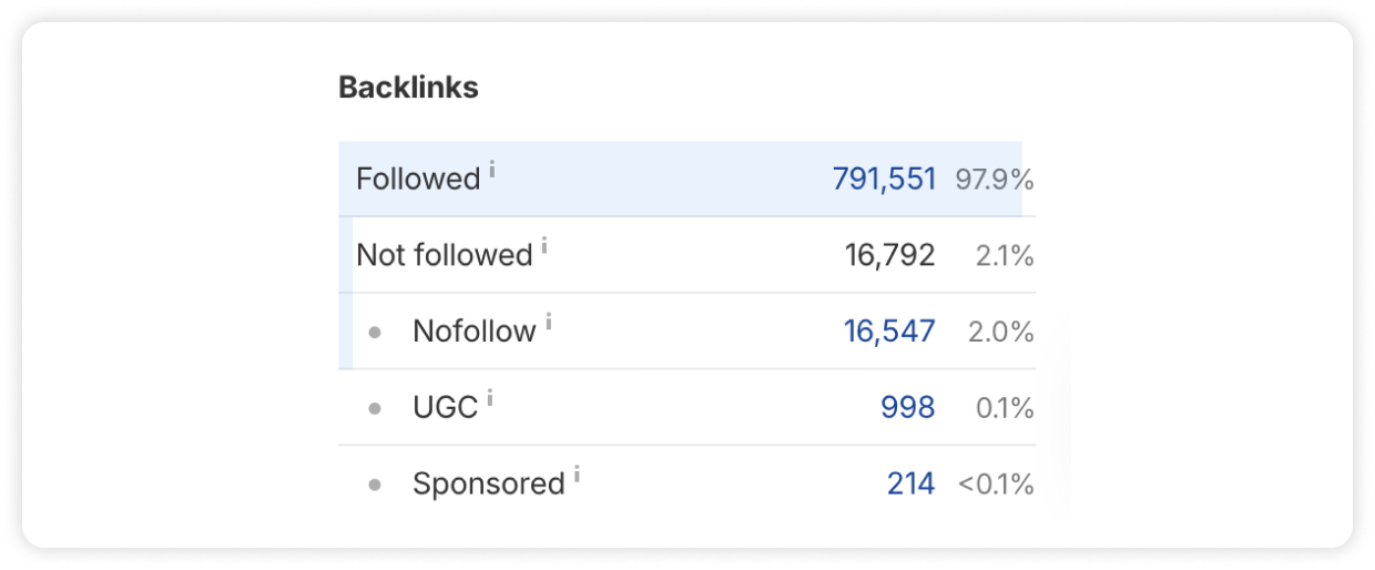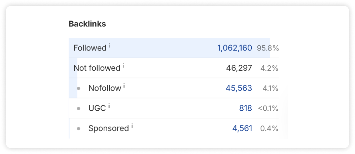 As for the types of backlinks Plausible has, we found that most of their links are dofollow, with a smaller share of nofollow and sponsored links – a natural pattern for a healthy backlink profile.