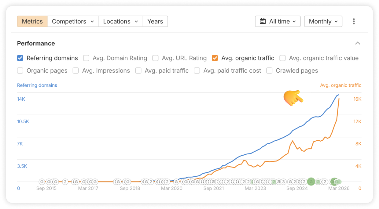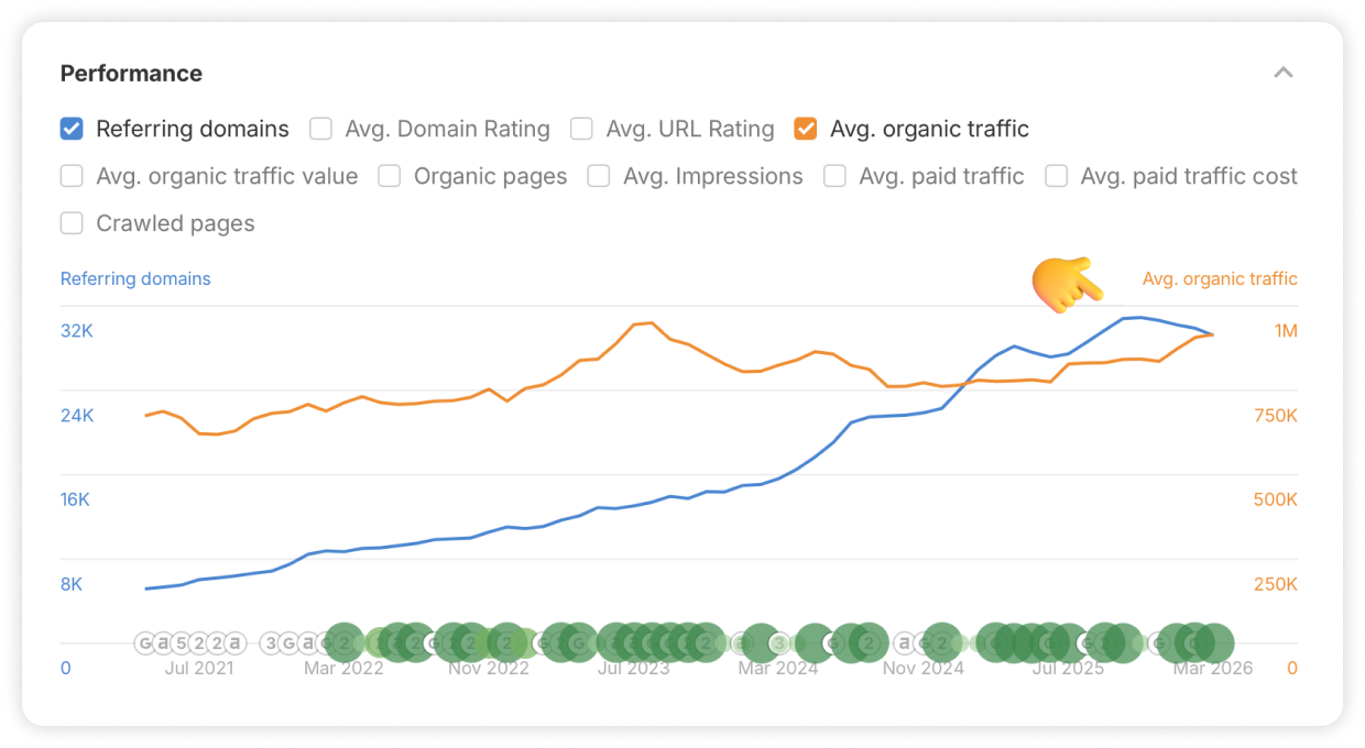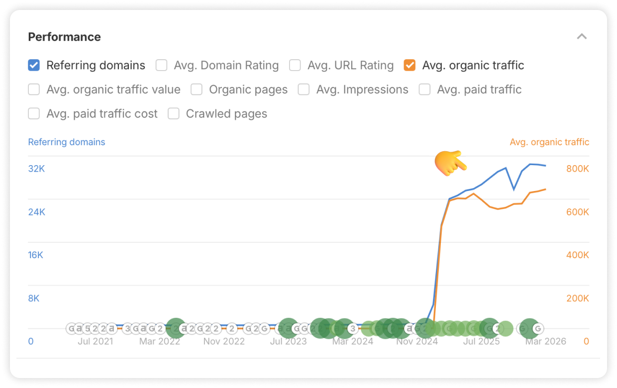 Just like with Plausible, the connection between their link growth and their actual traffic is hard to miss. Looking at the performance graph, there is a huge spike where the number of referring domains and organic traffic shoot up almost in unison.