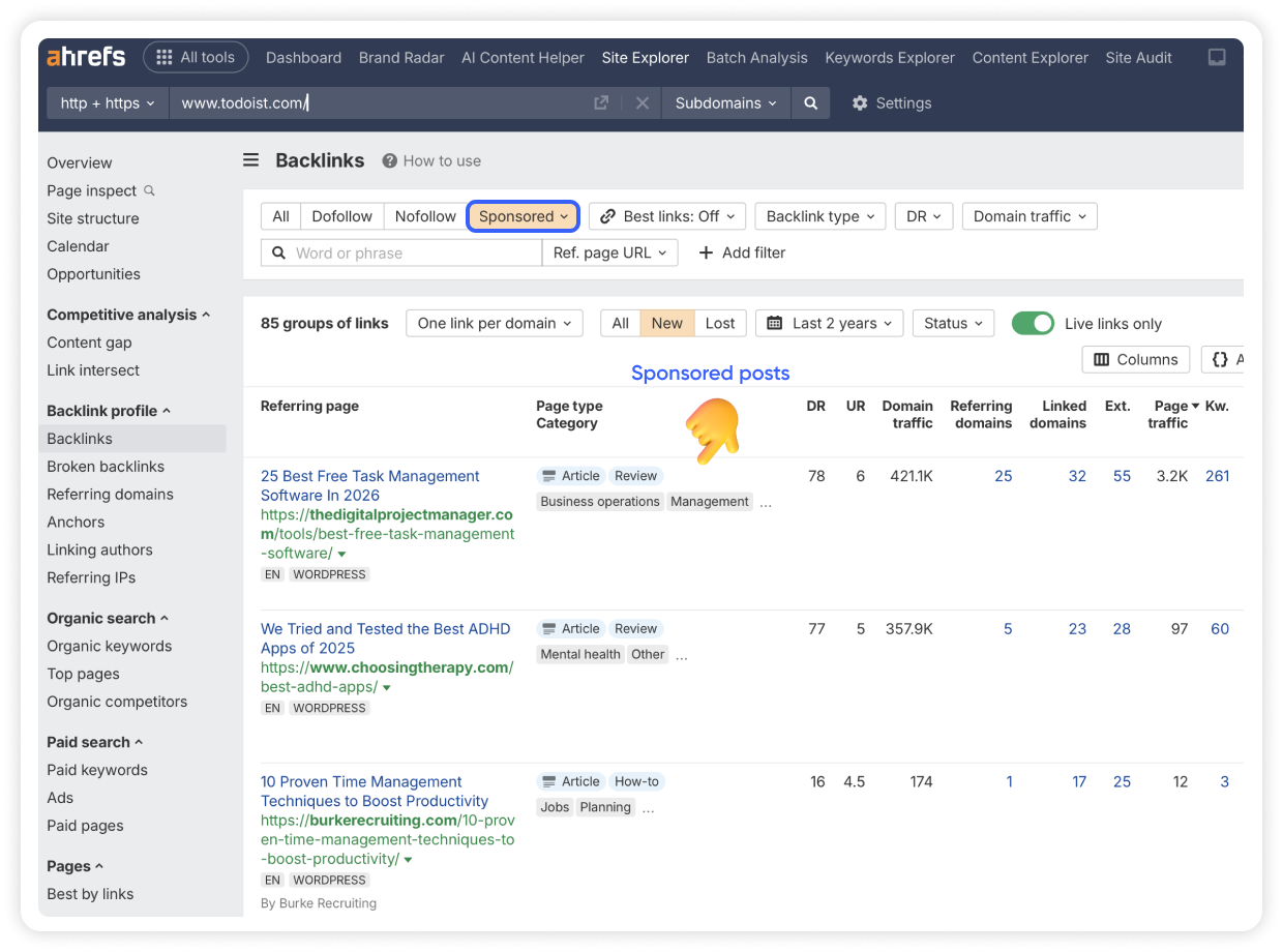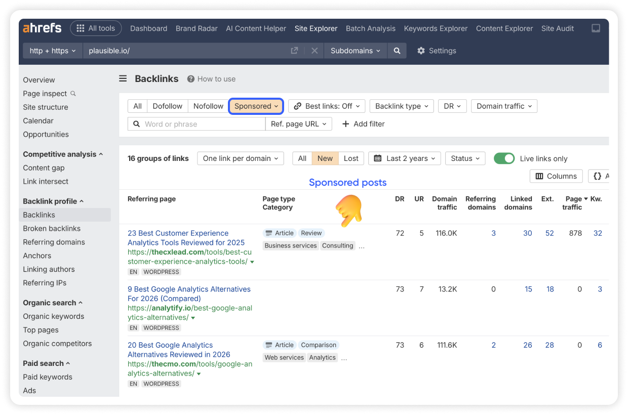 To analyze it even further, we can filter these results by the link type. For example, if we narrow it down to "Sponsored," you’ll see a group of placements that were likely paid.