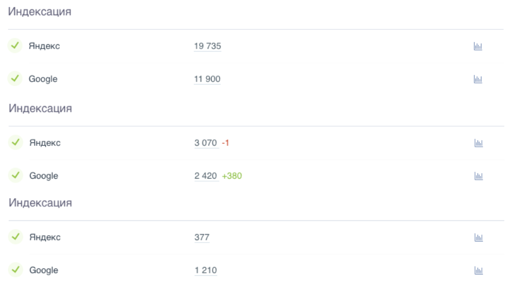 На этом скриншоте мы видим сайты с количеством страниц в индексе более приближенным к реальности. Разница между поисковиками различается в 2 раза. Это нормально, и логика здесь такая же, как и в предыдущем примере - скорее всего первый взял в индекс второстепенные страницы. Даже разница в 4 раза, как в третьей строке, не критична. Какую разницу можно считать критичной? Ответ такой, что когда в индексе, например, в одном поисковике 5 страниц, а в другом 1000. Если разница в несколько порядков, то это уже критично, и нужно разбираться, в чем проблема.