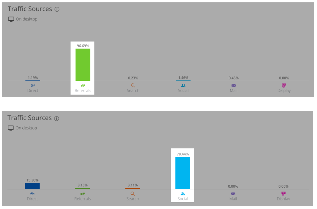 • социальный. Если я вижу высокий показатель социального трафика, то скорее всего не буду работать с такой площадкой. Площадки с 80-90% социального трафика создаются для заработка на кликах по рекламе, и поэтому они наливают трафик с соцсетей. Для SEO такая площадка неинтересна. Для контент-маркетинга тоже, поскольку если вы хотите получить внимание аудитории, то вам гораздо выгоднее купить рекламу у соцсетей напрямую.
