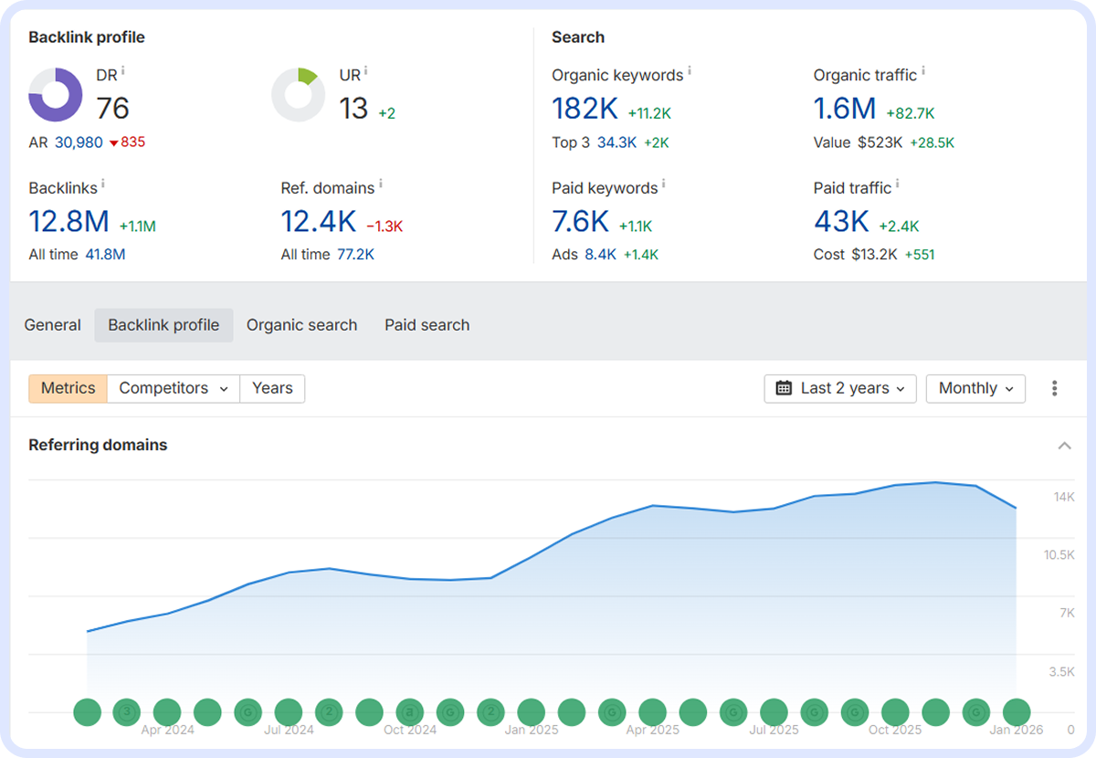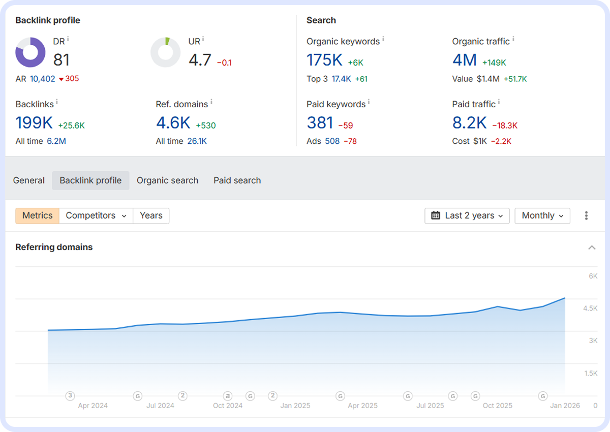 According to Ahrefs’ overview, the backlink profile was cleaned of a number of links from April to October 2025, and since then, the number of backlinks has been growing.