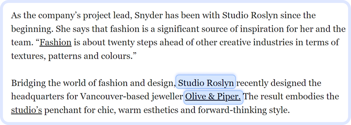 For instance, you can get an e-commerce brand link from an authoritative online news platform. Below is an example of a brand mention of Studio Roslyn and an e-commerce brand link to Vancouver-based jeweler Olive & Piper placed in an article on the Vancouver Sun website.