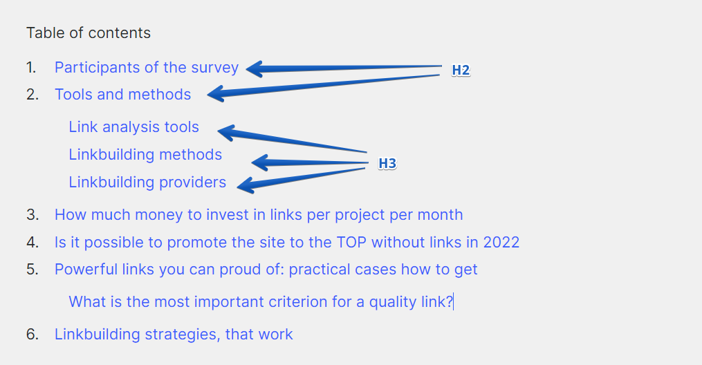 In the text of the article, the headings for levels 2 and 3 would read as follows (this is the content of our Linkbuilding strategies round-up, have you read?):