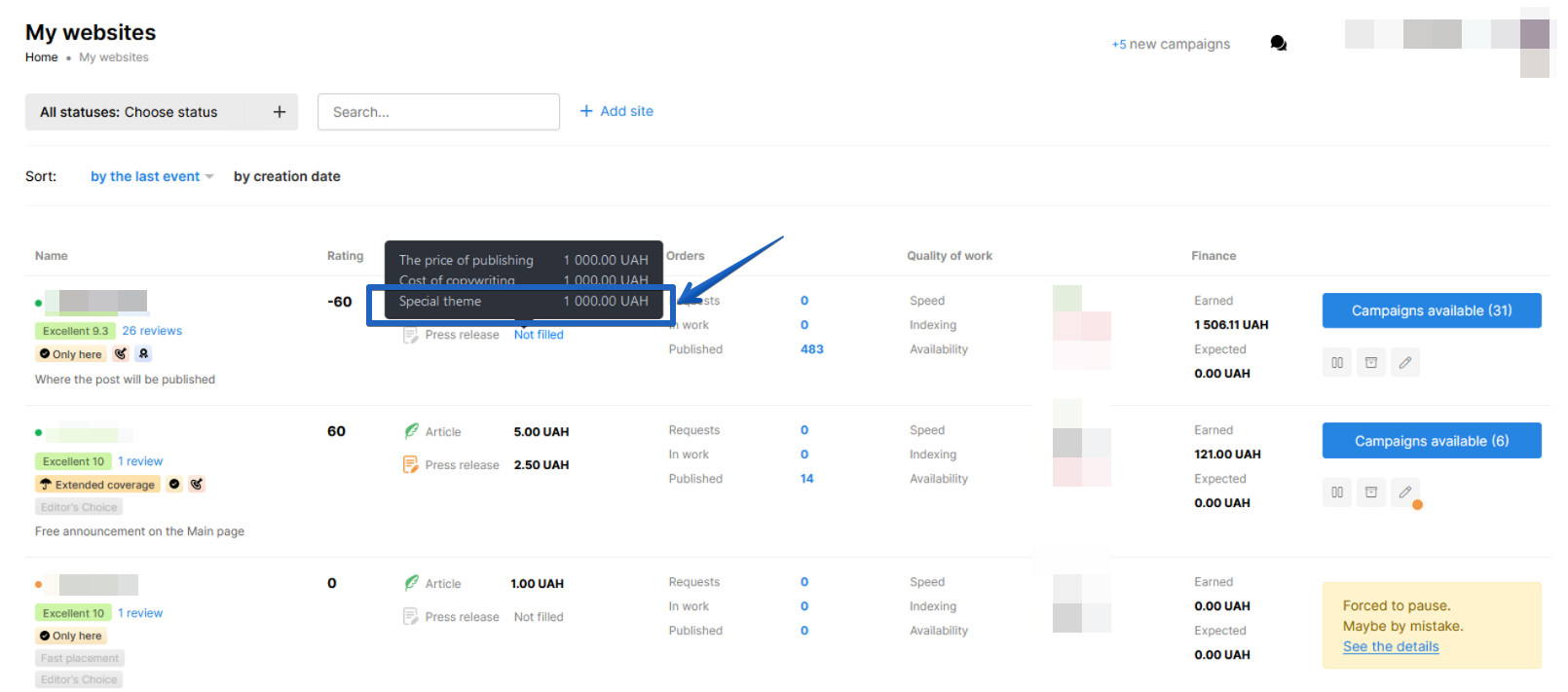 In the list of the sites in the column «Formats and price» when hovering over the site, you will see in the tooltip (which displays the price for various services) information about the cost of posting materials on special topics.