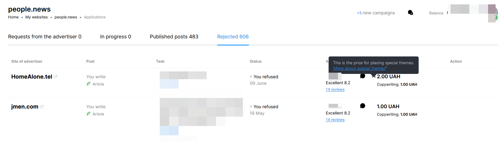 Prices for the placement of such materials can also be seen in the list of transactions with the customer and the owner. It is marked with the corresponding icon in the sections «Requests from the customer» and «Rejected»: