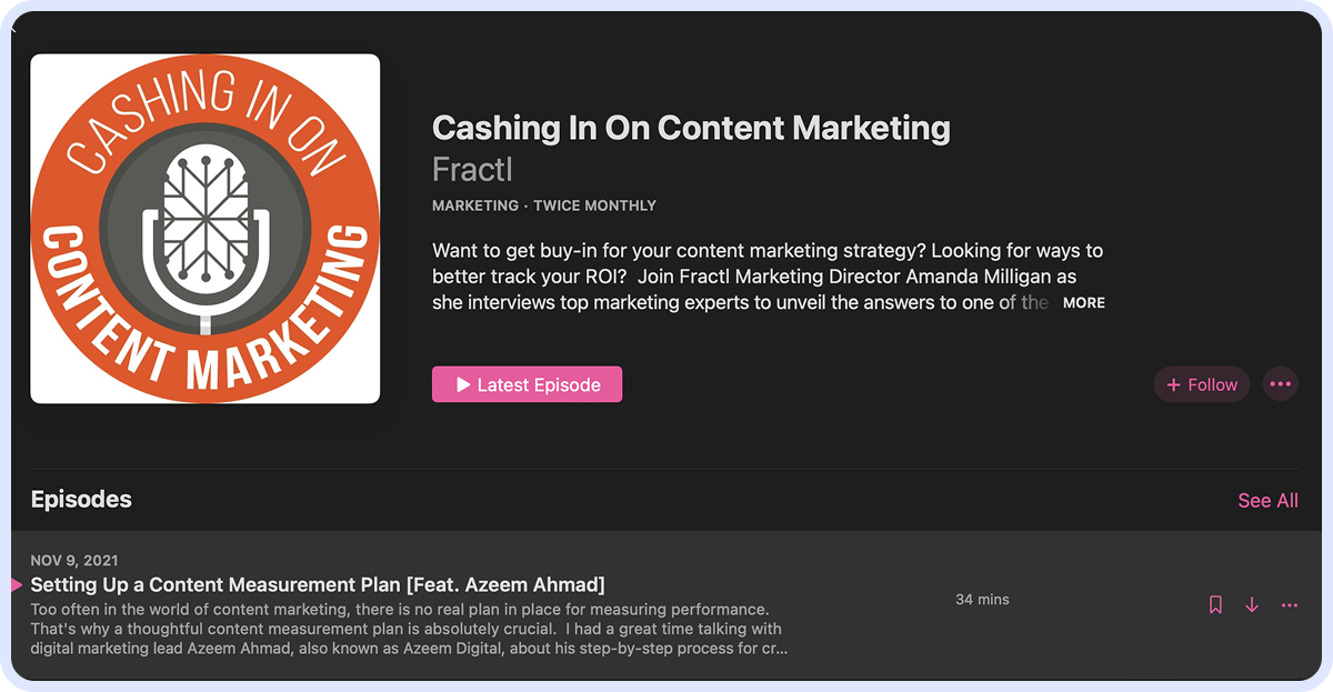 While it's not beginner-level material, many of her episodes clearly explain basement marketing principles and ideas, so relistening to her older podcasts will be ideal for someone who just got into the industry. You can find Cashing in on Content Marketing on YouTube and Spotify Podcasts.