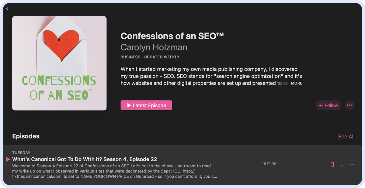 This short-form podcast (usually running around 15 minutes) by SEO researcher Carolyn Holzman. It discusses niche subjects in a relatable and often humorous way. Topics range from Google updates to SEO ethics, making it a unique resource for seasoned SEOs.
