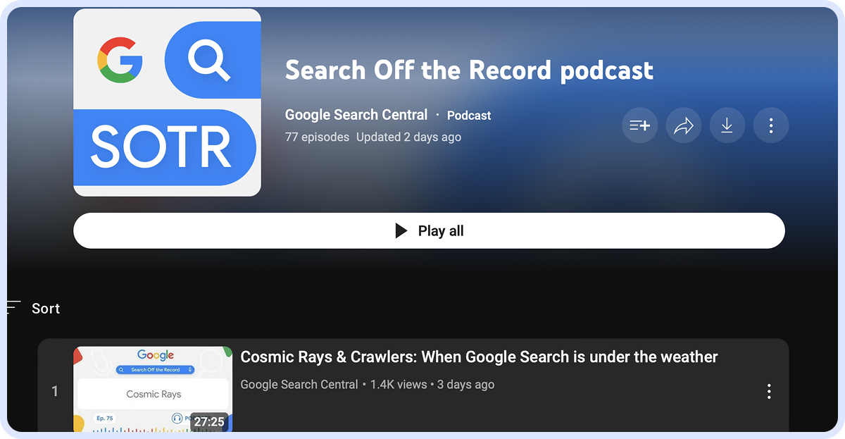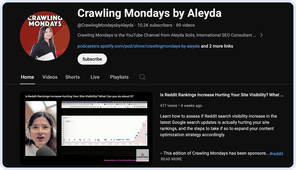 This YouTube-to-podcast show is hosted by Aleyda Solis and is released monthly on YouTube, Spotify, and Apple Podcasts. Though infrequent, the episodes include SEO reviews, interviews, and related news.
