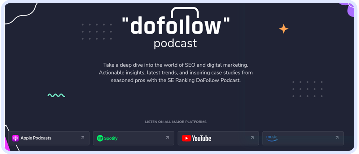 There are currently 47 episodes, with a new one uploaded each month. Each episode features an expert who delivers insights on a single theme. For instance, Search Engine Journal’s Barry Schwartz joined to discuss strategic shifts in SEO. Episodes usually last between 30 and 50 minutes. You can watch DoFollow Podcast on SE Rankin’s website, or on major podcasting platforms like Apple, Spotify, and Amazon. You can also watch DoFollow on YouTube.