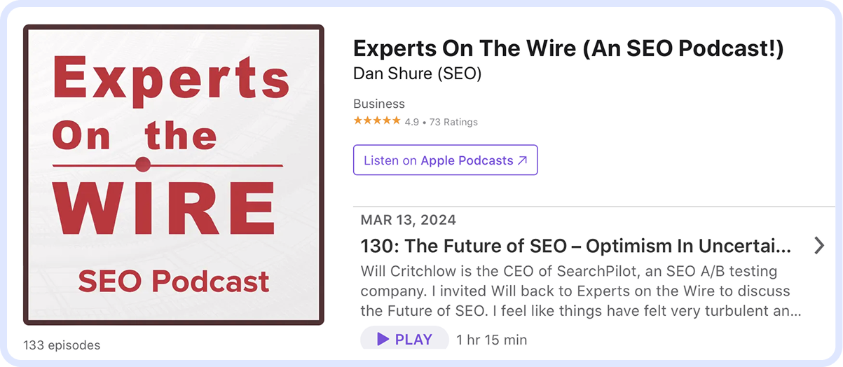 Hosted by Benjamin Shapiro, this SEO podcast is suitable for all levels and covers a wide range of SEO topics, from fundamental to advanced. The short episodes, which last around 20 minutes each, cover various straightforward issues, such as Why and How to Run SEO tests and The Future of Google Search.