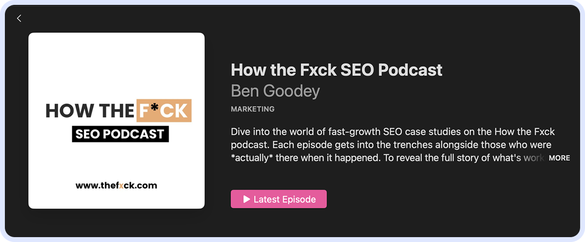 How the Fxck podcast by Ben Goodey, founder of How the f*ck, explores the world of SEO case studies and dives into what is working in the industry right now. While it seems that the new episodes have become less frequent, there are over 70 older episodes featuring guests such as John Spilker, Trish Seidel and more that you can go back to.
