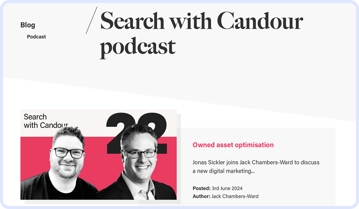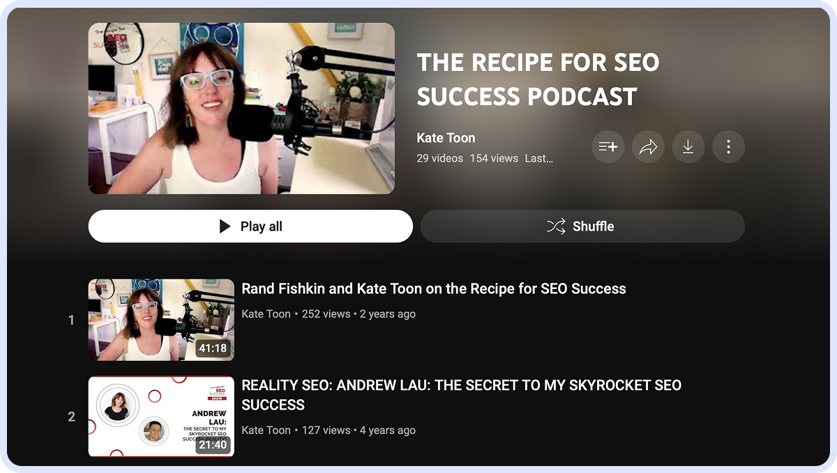 Search with Candour is released weekly, and each of the one-hour-long episodes features a different guest and a topic, as in How to Build Topical Authority with Shaunda Necole. You can listen to it on Spotify, Apple Podcasts, and YouTube Music.