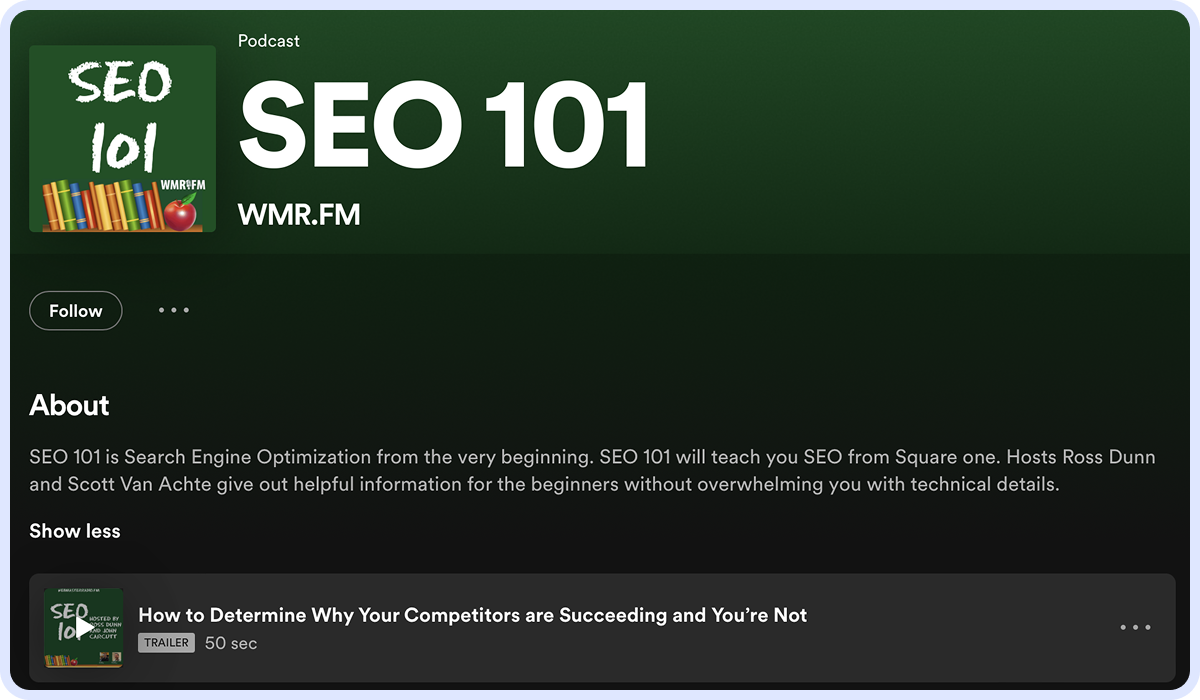 SEO 101 Podcast currently has over 460 episodes, and new ones are released every three weeks so that you won't run out of listening material soon. The average episode runs from half an hour to fifty minutes, and you can listen to it on all major podcast platforms, such as Spotify or Apple Podcasts.