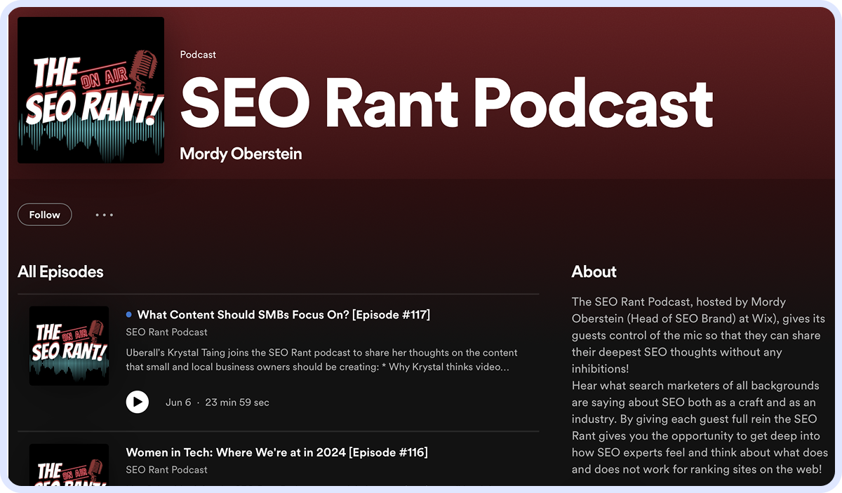 SEO Rant by Mordy Oberstein, head of SEO Brand at Wix, covers topics for all levels, focusing on current trends and expert opinions. Each episode features a different SEO expert sharing their experience and thoughts on the modern industry.
