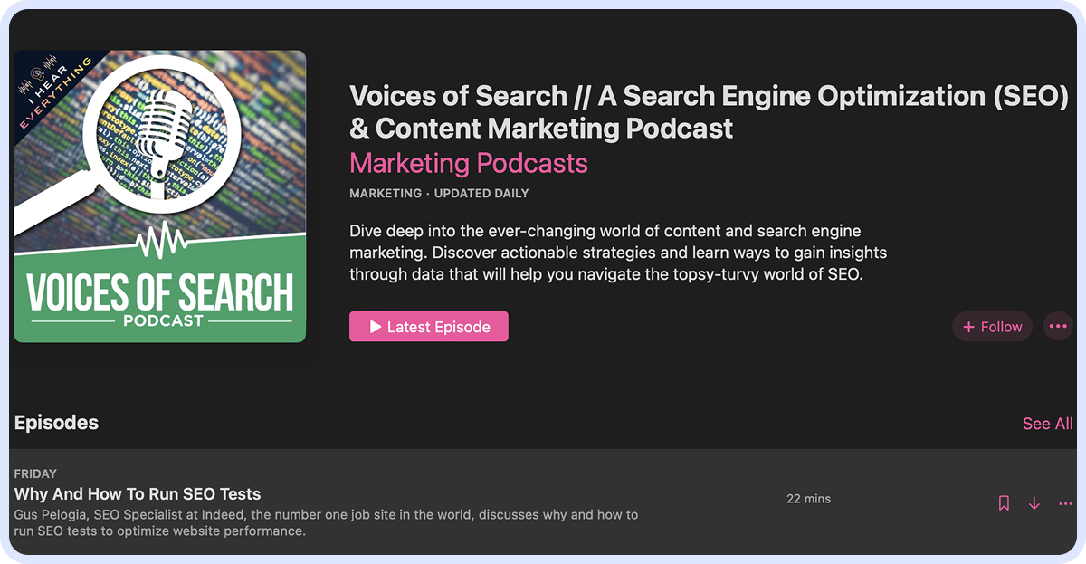 This might be one of the longest-form podcasts on the list, with each episode running around an hour and a half. It's perfect for those who want to explore the profession more without diving into technicality and get inspired by industry leaders. We recommend their recent episode, How to Charge THOUSANDS for SEO consulting, to get a glimpse of what to expect. It's available on Spotify, Apple Podcasts, and YouTube.
