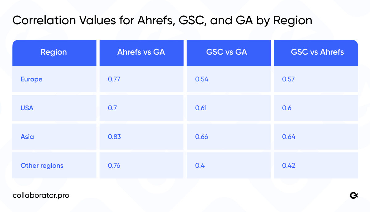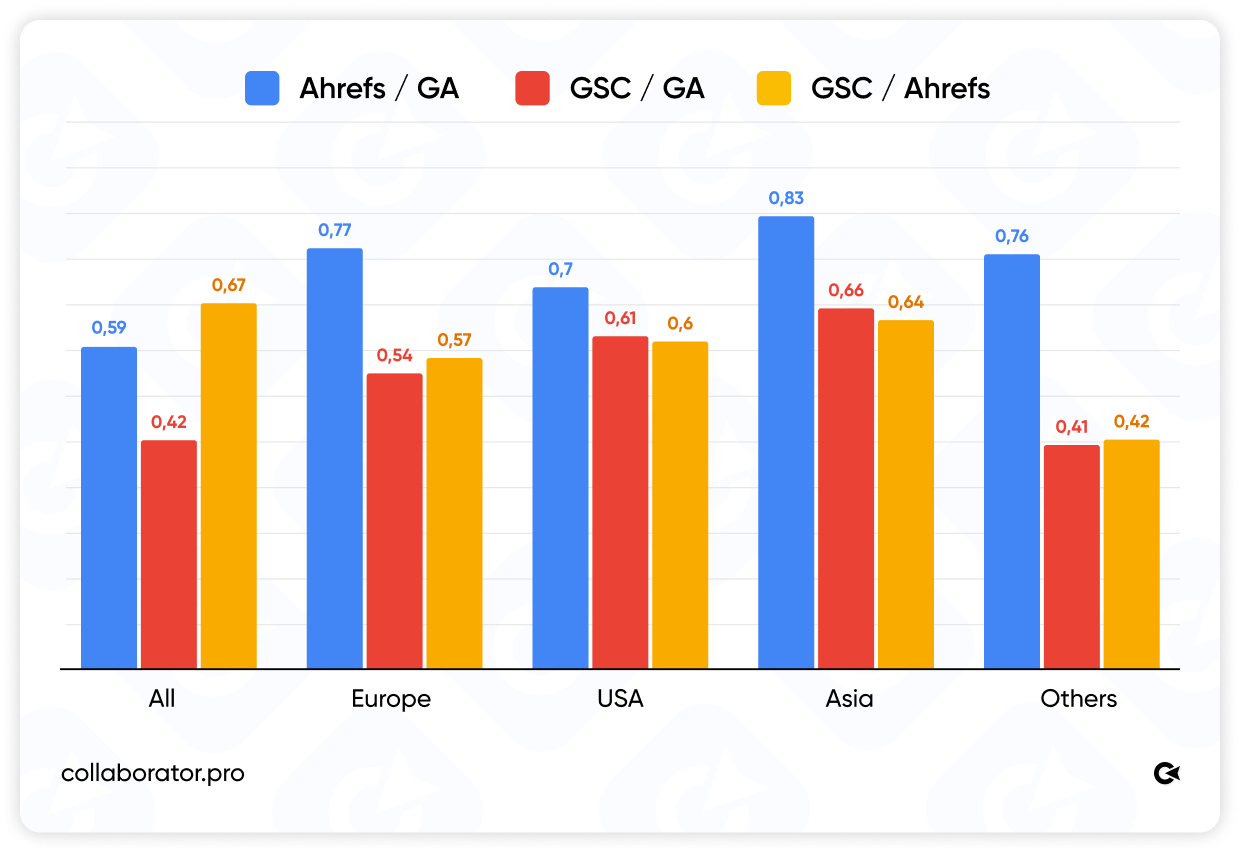 Next, correlation was calculated for each pair of data sources: Ahrefs vs GA, Ahrefs vs GSC, and GA vs GSC. The analysis was also conducted separately across different geographic segments: Europe, the USA, Asia, and other regions.