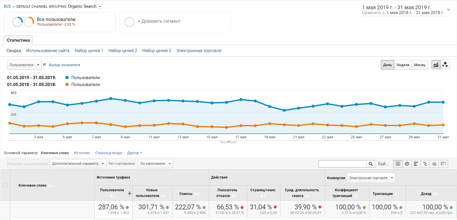 В результате всей проделанной работы, получилось подготовить надежный “фундамент” (в техническом плане) для дальнейшего продвижения и получили равномерный рост ссылочной массы, что, в свою очередь, способствовало приросту целевого органического трафика на 287% при сравнении год к году.