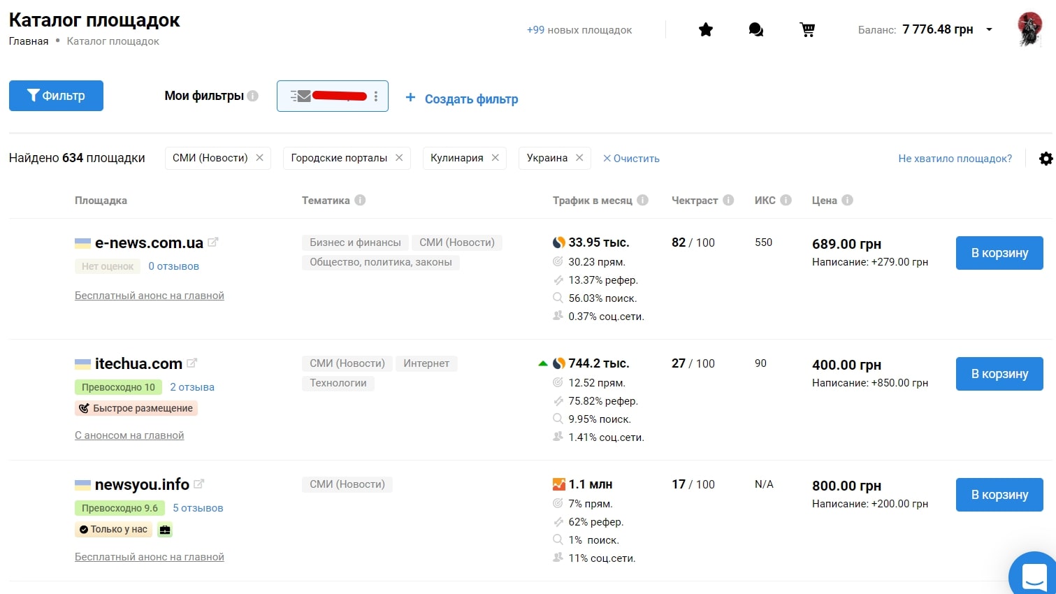 С минимальными настройками Коллаборатора получали внушительное количество площадок. Удобно, что у многих площадок верифицирована аналитика и есть удобный фильтр с помощью которого выбрали доноров опираясь на: количество трафика, количество поискового трафика, траст домена.