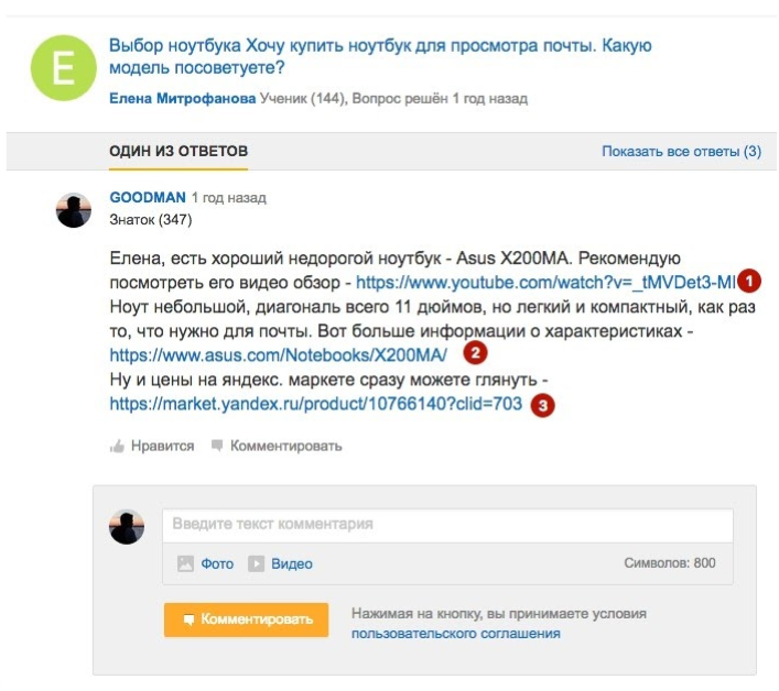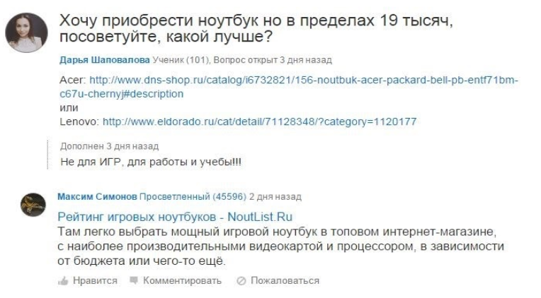 На этом примере девушка ищет недорогой ноутбук, а пользователь сбрасывает ссылку на игровые ноутбуки, которые стоят в пределах 1000$. Мы видим, что реакция не очень позитивная.