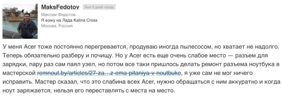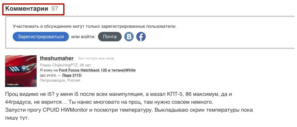 Так выглядит крауд-маркетинг в комментариях. Здесь важно обратить внимание, что это автомобильное сообщество, в котором идет обсуждение компьютеров. Позже я расскажу, почему это важно.