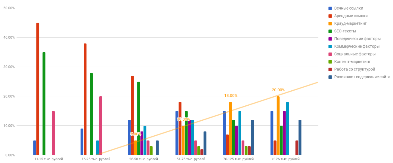 На этом слайде из презентации ребят из 3net вы можете наблюдать срез крауд-маркетинга по рынку. Снизу мы видим бюджет клиента на SEO-продвижение, а слева процентная составляющая по конкретному виду работы. Мы видим, что при бюджете 200$ крауд-маркетинга нет вообще. Внешняя оптимизация делается за счет арендных ссылок. При бюджете до 350$ внимание все так же тратится на арендные ссылки, и уже при более высоком бюджете начинается крауд-маркетинг. Он используется более активно по мере возрастания срока сайта и увеличения бюджета.