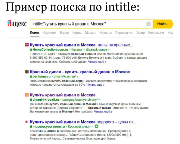 Задача: Сравнение релевантности title. Запрос «Купить красный диван», гео Москва.