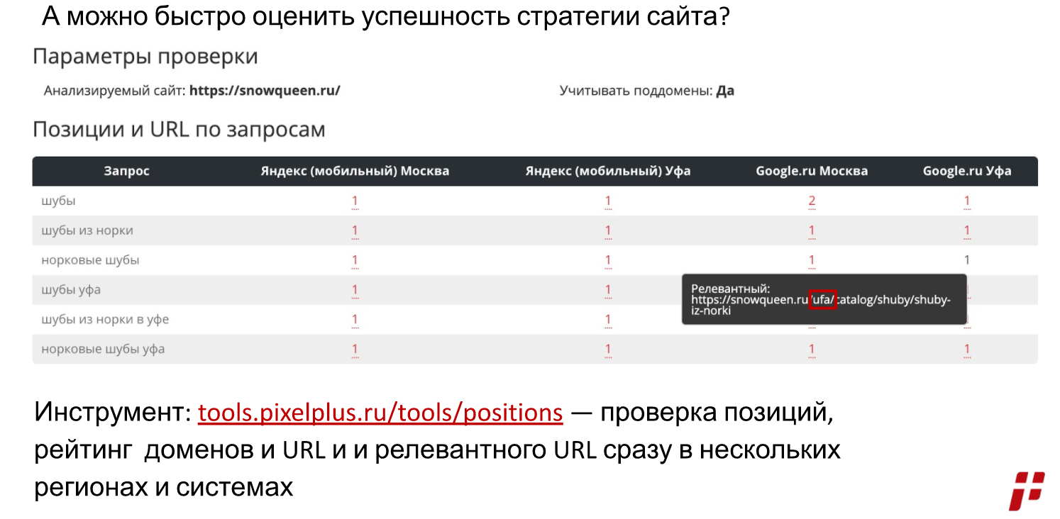 Второй – это «быстрый чек», где мы можем посмотреть url-адреса, представленные в выдаче по каждому региону, который вас интересует. Тем самым мы можем просто понять, какие проекты там представлены, и определить оптимальную стратегию.
