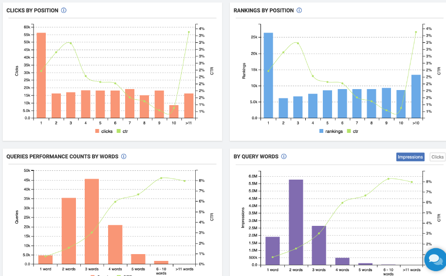 В правом нижнем у нас деление по количеству слов в поисковом запросе. Показано, как меняется CTR, impression, клики в зависимости от количества слов.