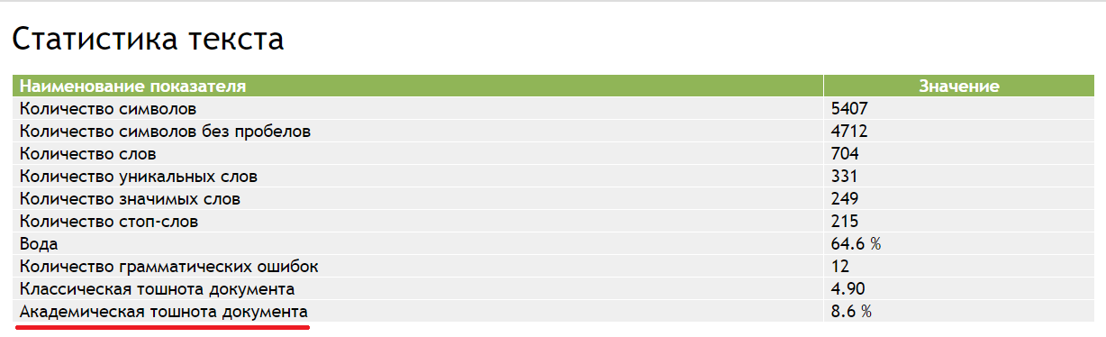 Копируем статью и проверяем её на уникальность и наличие орфографических ошибок и других огрехов в сервисе Орфограммка или семантическом анализе текста Advego. В Advego обращаем внимание на академическую тошноту документа (8,6%).