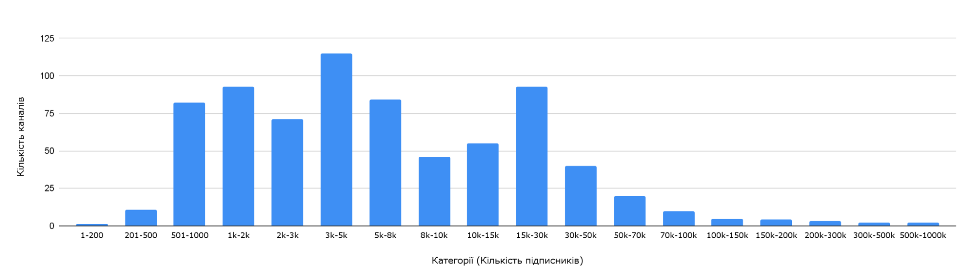 - За кількістю підписників найбільше каналів в сегментах 1-2k, 3-5k і 15-30k