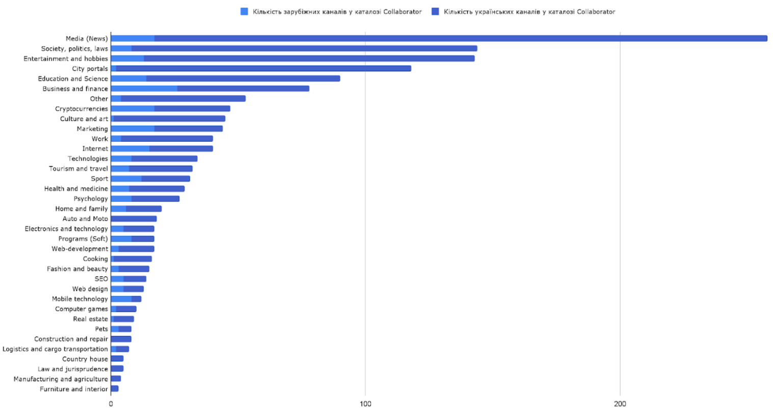 - Найбільше каналів в каталозі в тематиках Медіа, Суспільство, політика, право, Розваги та хоббі. Також в десятку лідерів входять: Міські портали, Освіта та наука, Бізнем та фінанси, Крипта, Культура й мистецтво, Маркетинг, Робота. Ці ж напрямки — лідери за кількістю укладених угод