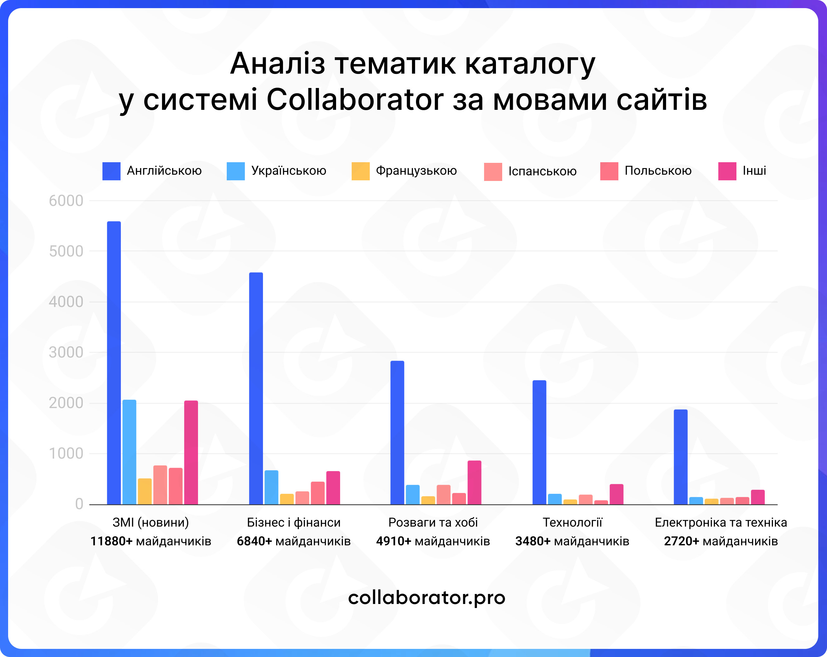 У каталозі Коллаборатора — 25 000+ майданчиків зі 130+ країн світу, а топ 5 гео за кількістю сайтів очолюють США, Україна, Великобританія, Франція та Польща