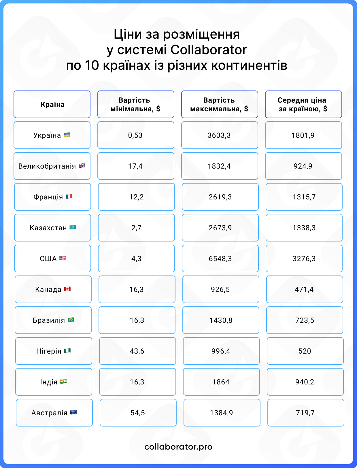 Вартість змінюється і залежно від країни. Для більшої наочності наведемо приклад 10 країн із різних континентів та ціни за розміщення на сайтах:
