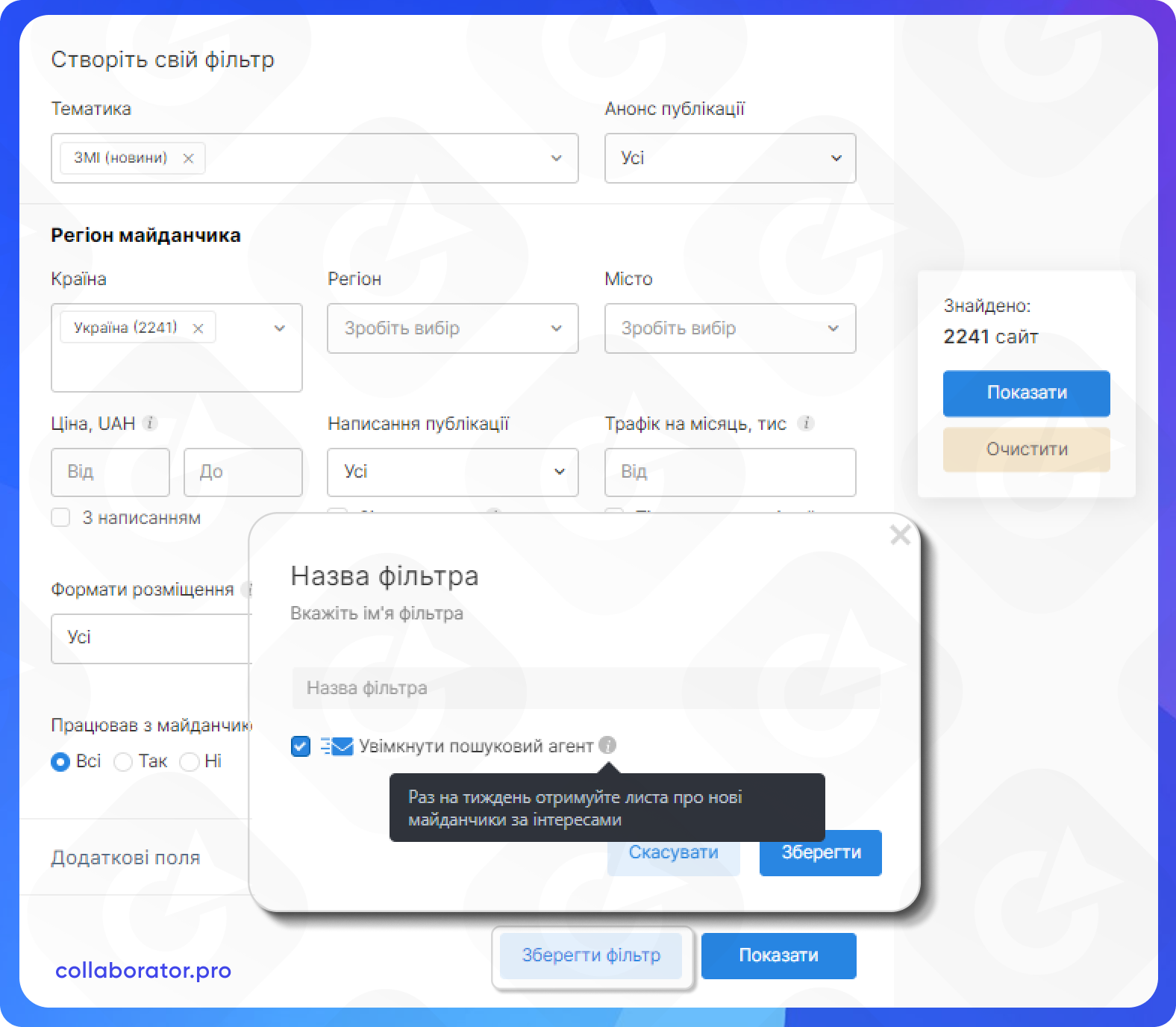 Зручна система фільтрації: швидкий пошук медіа за країною, регіоном, містом та іншими параметрами — допоможуть швидко обрати трастовий сайт з відповідним контентом та даними, підтвердженими авторитетними сервісами Google Analytics, Ahrefs, Majestic, Moz, Similarweb.