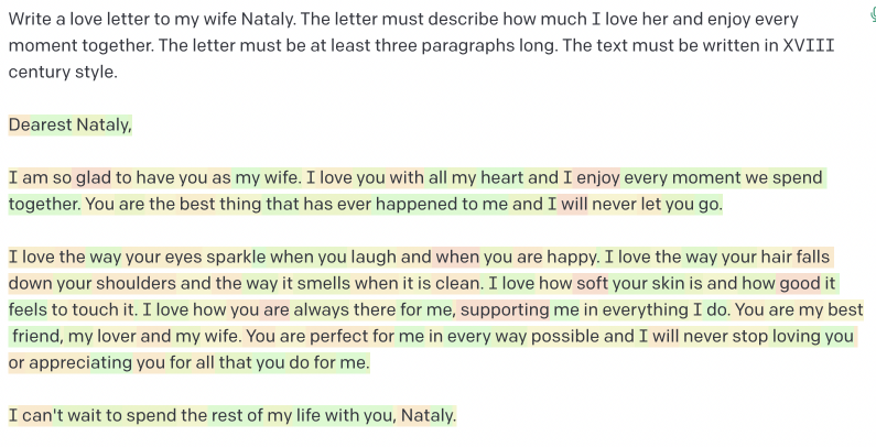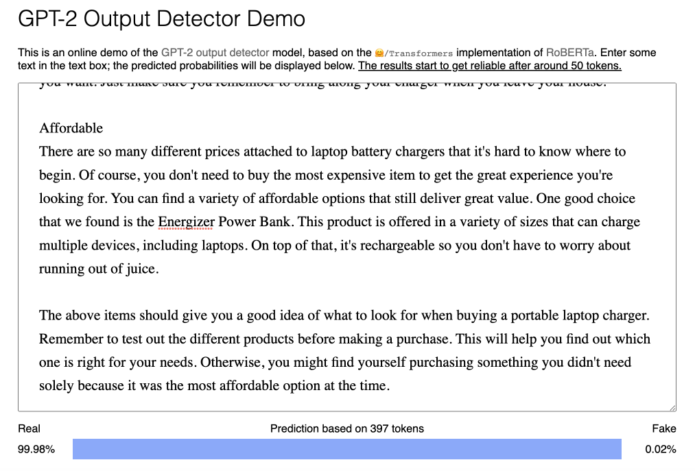 При цьому використання таких моделей як GTP3 дозволяє готувати тексти, які доволі складно відризнити від натурального. В інтернеті існує багато всяких інструментів, які наче можуть знаходити такі тексти. Але наші тести показують, що не завжди вдається. Нижче на скріні інструмент показує, що цей текст 100% реальний, хоча насправді він був сгенерований.