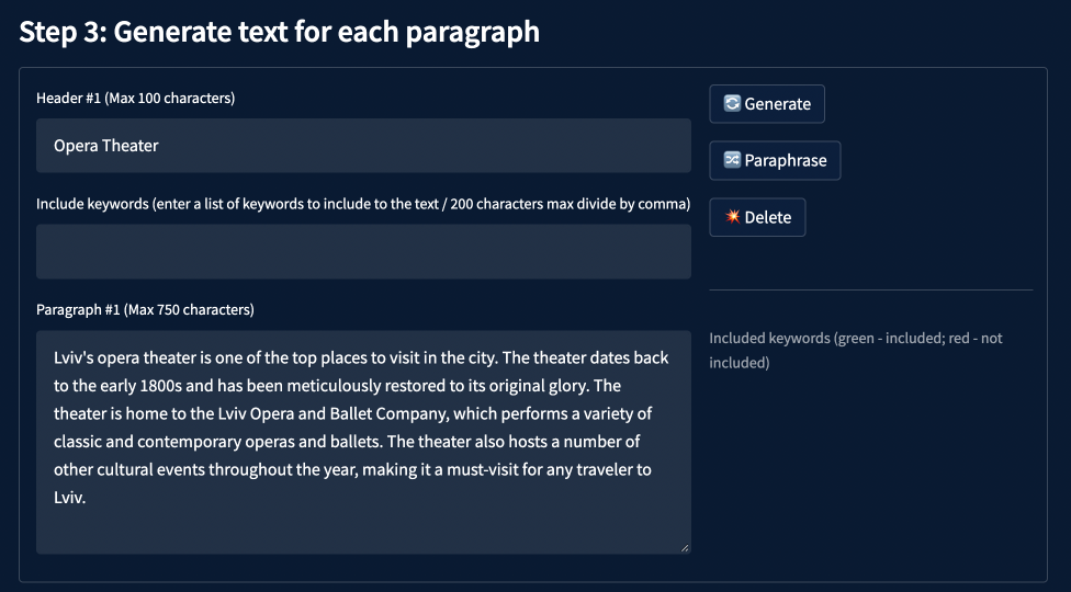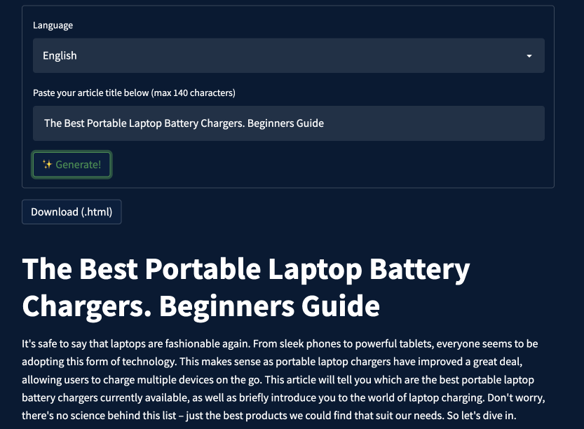 Тобто на вході ви даєте назву статті, яку хочете отримати, і от алгоритм видає текст. Якщо чесно, я був здивований, яку гарну якість текстів інструмент дає на виході. Я говорю про різноманіття унікальних слів, складність речень, водність, повтори. Краще порівняно з OpenAI.