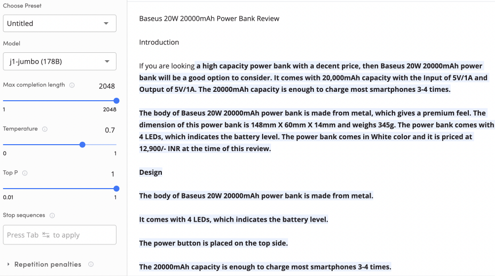 Модель j1-jumbo (178B). Тут інтерфейс та функціонал майже такий самий. Система генерує більш-менш нормальні тексти, які можна потім рерайтити, і використовувати реально. Але все одно, якість поступається тому, що є в OpenAI, і чесно кажучи, значно дорожче. На перших порах ми були впевнені, що вони просто використовують АПІ Опен АІ, але порівнюючи результати, зрозуміли, що ні, що в них все своє.