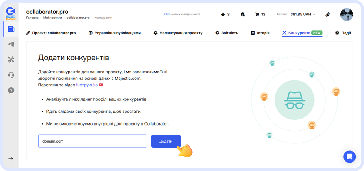 - Перейдіть у розділ Мої проєкти → оберіть проєкт → Конкуренти у своєму акаунті Collaborator