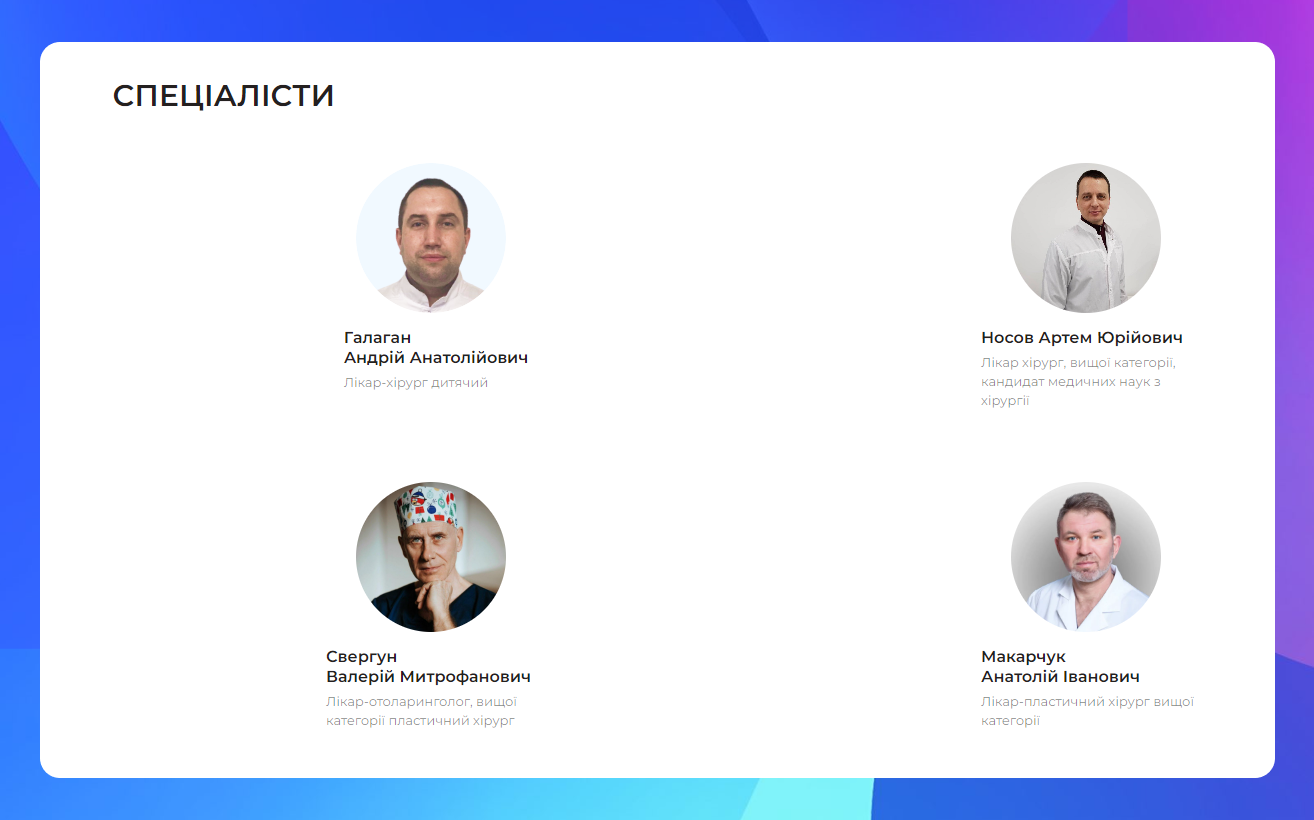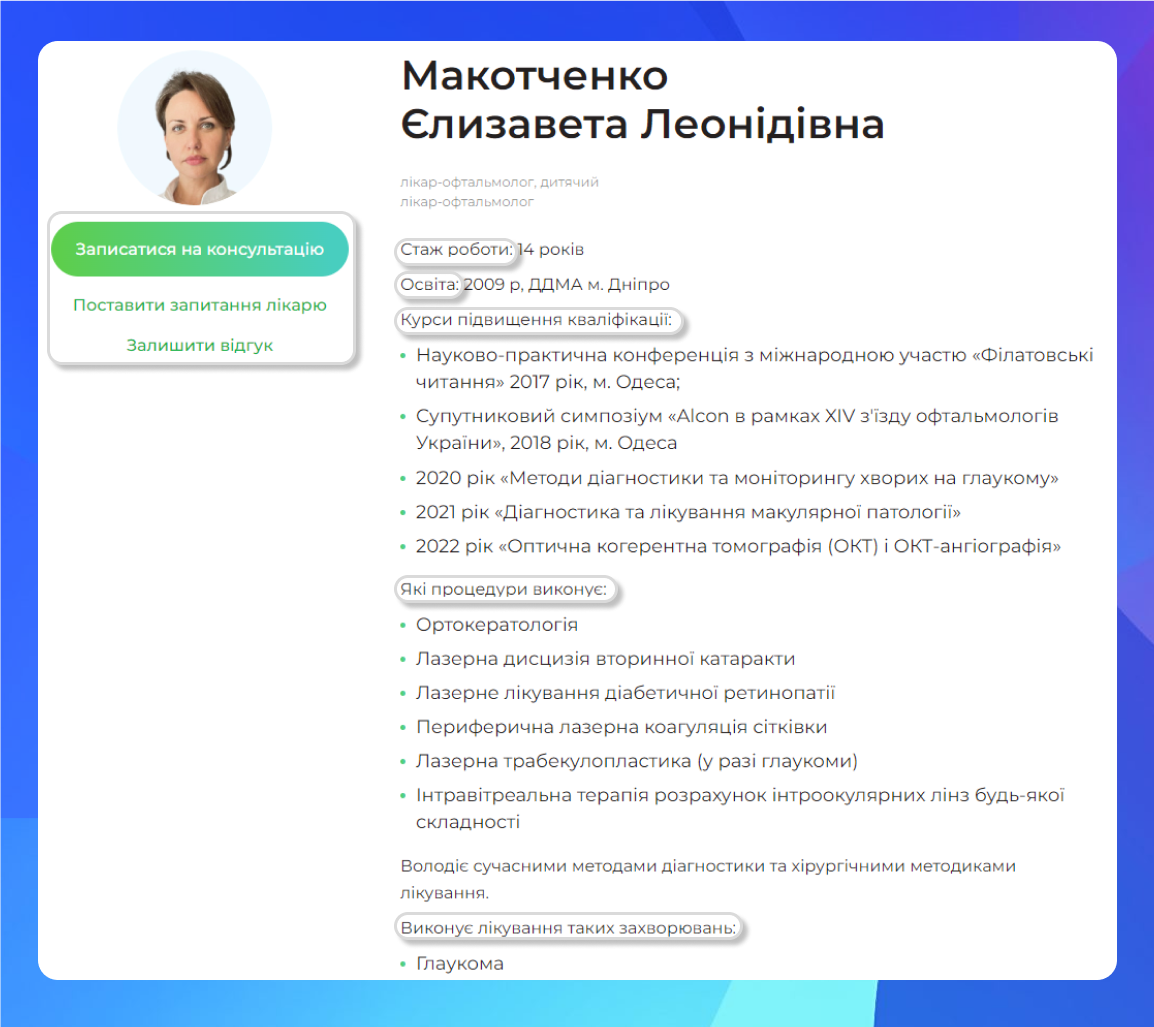 - Сторінки лікарів з детальним описом професійної діяльності, досвіду, сертифікатів/нагород та посиланнями на соціальні мережі або інші сторонні ресурси, що підтверджують реальність фахівця.