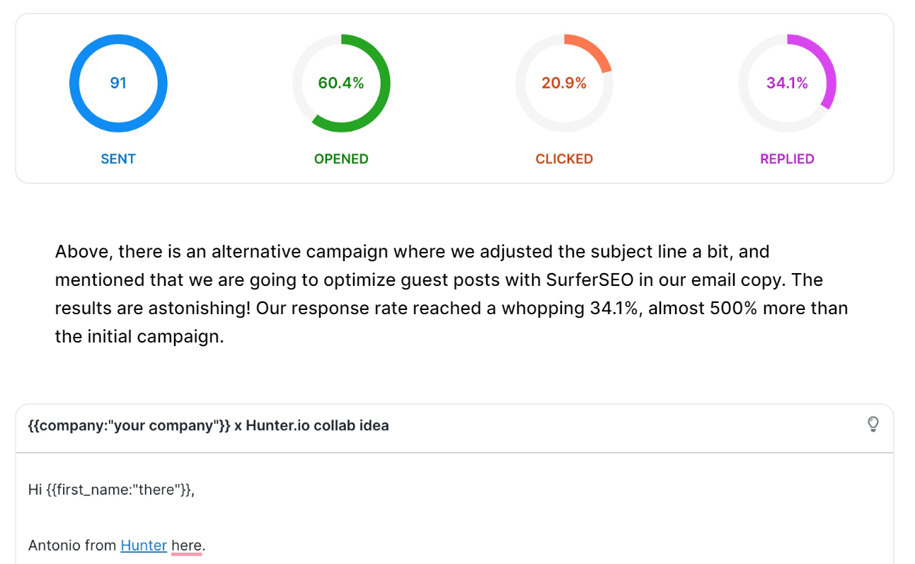 Компанія Hutner.io опублікувала гест пост на Searchers ISO, у якому розписала власні Open rate (це про лінкбілдинг стаття) і розказали, як їх responce rate піднявся на 34%. Це реальний потужний use case, який можна було розмістити у власному блозі і широко його дистрибувати. Проте представники Хантеру віддали цей контент у якості гостьового матеріалу і їх опублікував трастовий майданчик.
