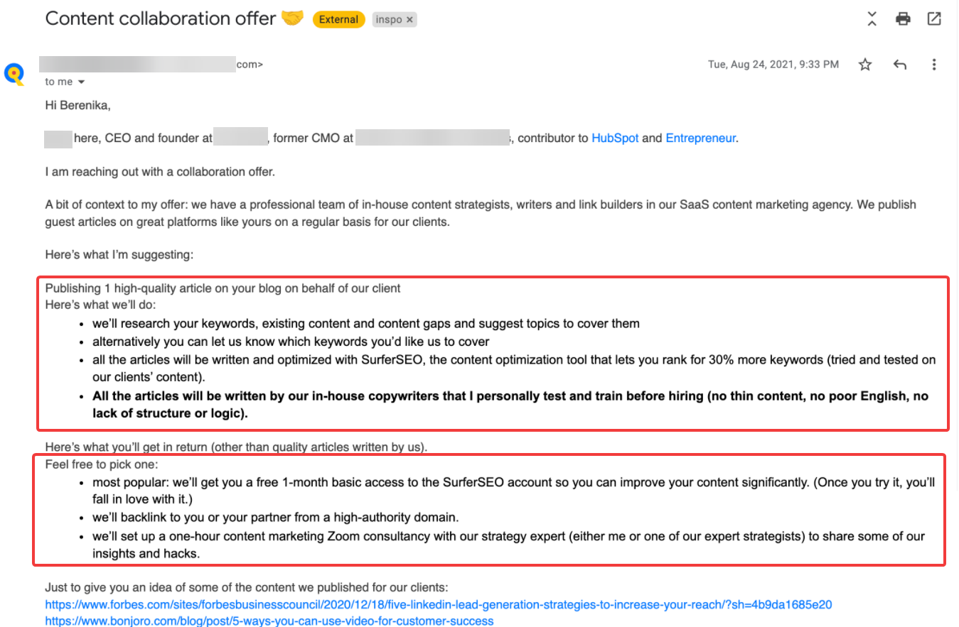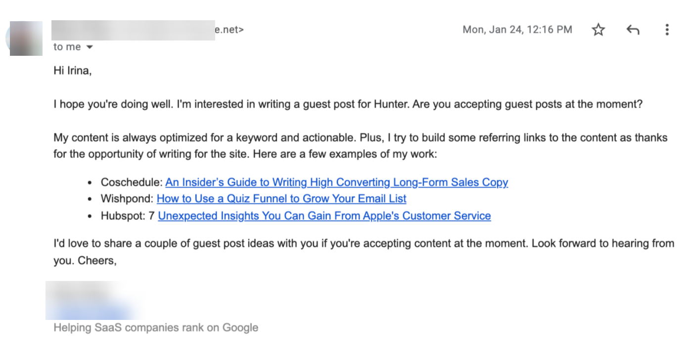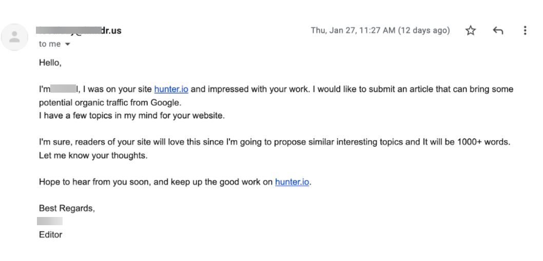 Це реальний лист до Hunter.io мені дала їх CMO як приклад аутрічу, на який вона ніколи в житті не відповідає. Тут нічого немає, окрім того, що людина задоволена роботою Hunter і хоче запропонувати статтю, є якісь ідеї. Але це так не працює, бо редактор не бачить цінності взагалі.