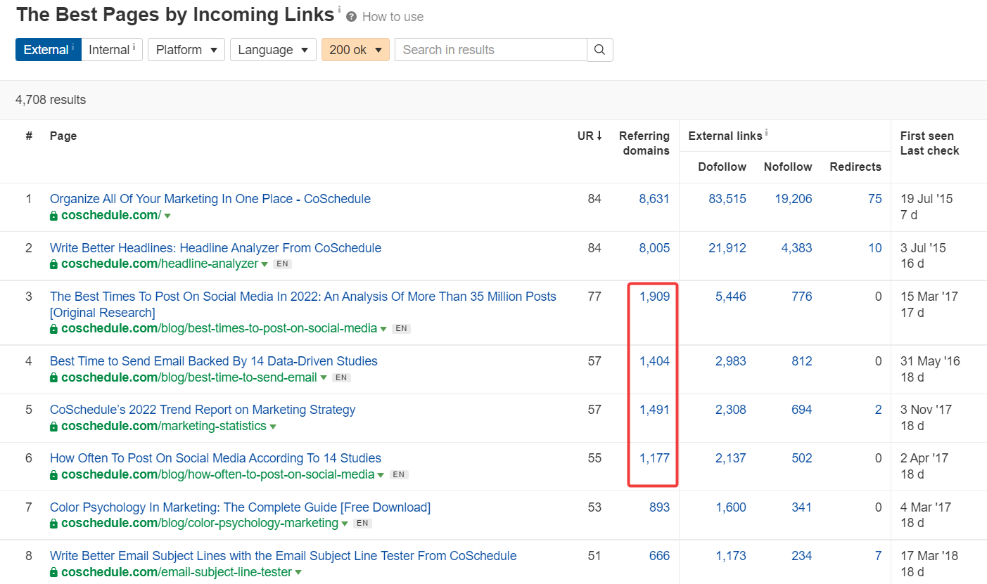 Наприклад, СoSchedule зібрав більше 6K+ referring domains на одну статтю типу «найкращий час постити в соцмережі» . Вони роблять кожен рік це, але це одна стаття, яка приносить колосальні результати.