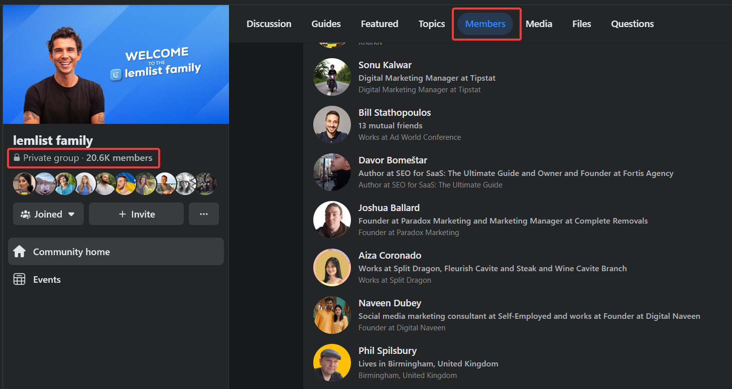 Так само у Facebook можна не просто лінкбілдинг-спільноти шукати, а долучатись до нішових груп, типу lemlist family — це все про холодний аутріч.