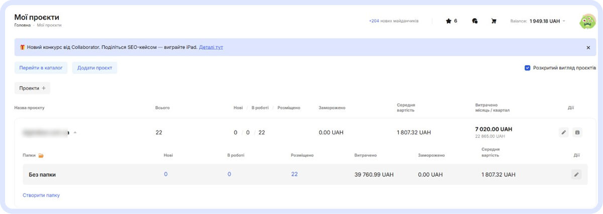 Закупівля посилань розпочалася не одразу, а через кілька місяців після запуску сайту. Це дозволило підготувати якісну базу з контенту, на яку вже мало сенс ставити зовнішні лінки. Основним інструментом для розміщення стала платформа Collaborator — зручне рішення для українського ринку, де можна працювати лише з перевіреними сайтами.