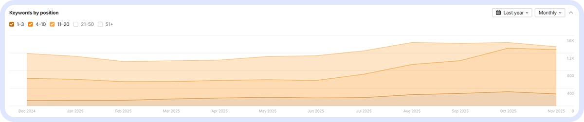 Такий підхід дозволив швидко нарощувати видимість сайту в тих сегментах, де конкуренція нижча, а конверсія — вища.